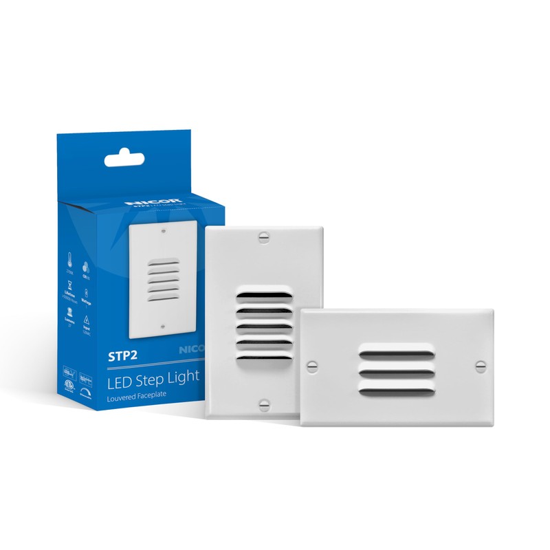- Includes one LED Step Light and two White Louvered Faceplates (Vertical and Horizontal)
