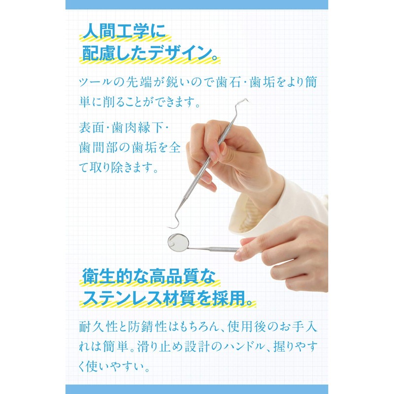 - ✅ 【仕様】安全で高級なステンレス製を採用。歯用ミラー、鎌形ツール①②、鍬型ツール、ピンセット。