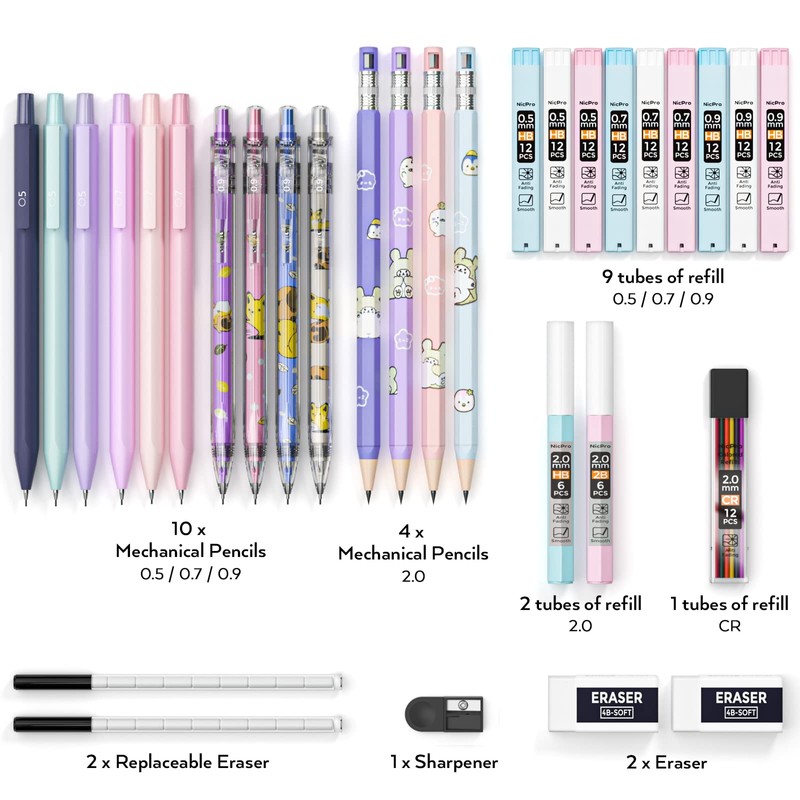 Nicpro 32PCS Cute Mechanical Pencil Set in Case, 14PCS Pastel Aesthetic Pencils 0.5 & 0.7 & 0.9 mm & 2mm Lead Holder, 12 Tubes Lead Refills(2B HB Colors), 3 Erasers For School Student Girls Writing