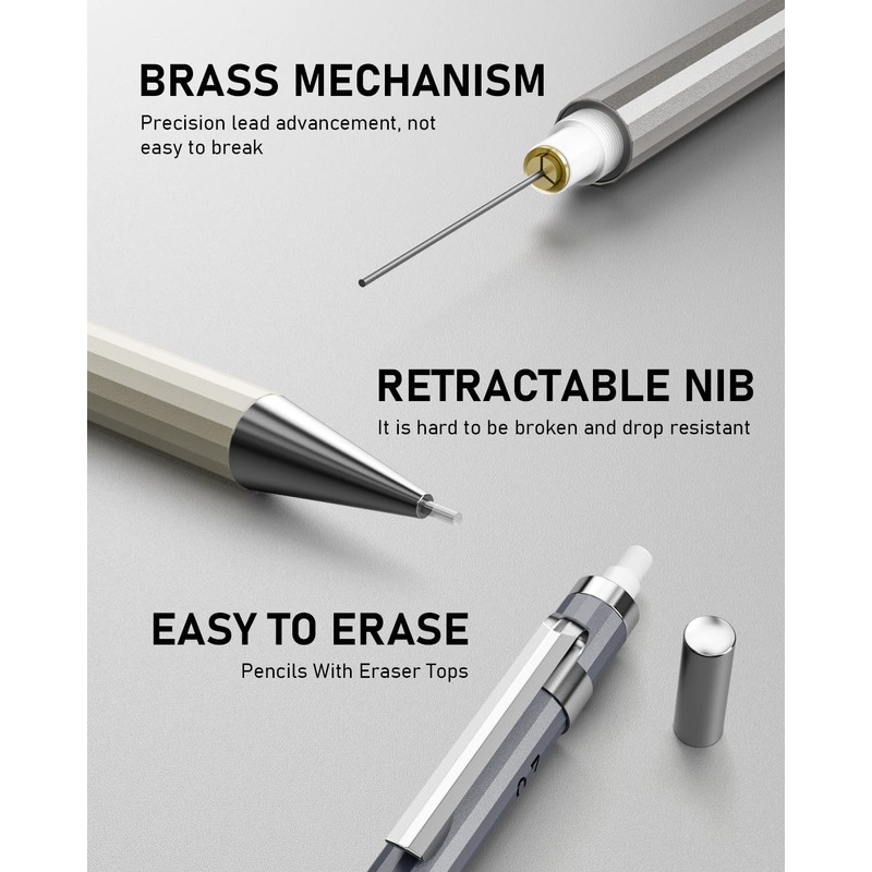 - Good Weight & Smooth Writing: These lead pencils are full-brass metal body provides nice weight balance for fatigue-free writing and drawing.Retractable tip and sliding sleeve design, enhance shock-absorbing and protect the tip better.Ideals for artists, professionals, teachers and students alike. Convenient to carry your whole mechanical pencils set everywhere. Perfect for writing, drafting, drawing, sketching.