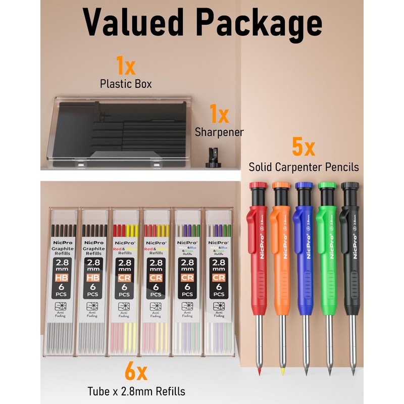 - Wertvolles Baubleistift-Set: Sie erhalten 5er-Pack solide Zimmermannsbleistifte mit 41 Stck 2,8-mm-Nachfllungen, 1 austauschbaren Spitzer, 1 Kunststoff-Aufbewahrungsbox. Mit der kompletten Zimmermannsbleistiftkombination k?nnen Sie Ihre Arbeit schneller und einfacher erledigen.