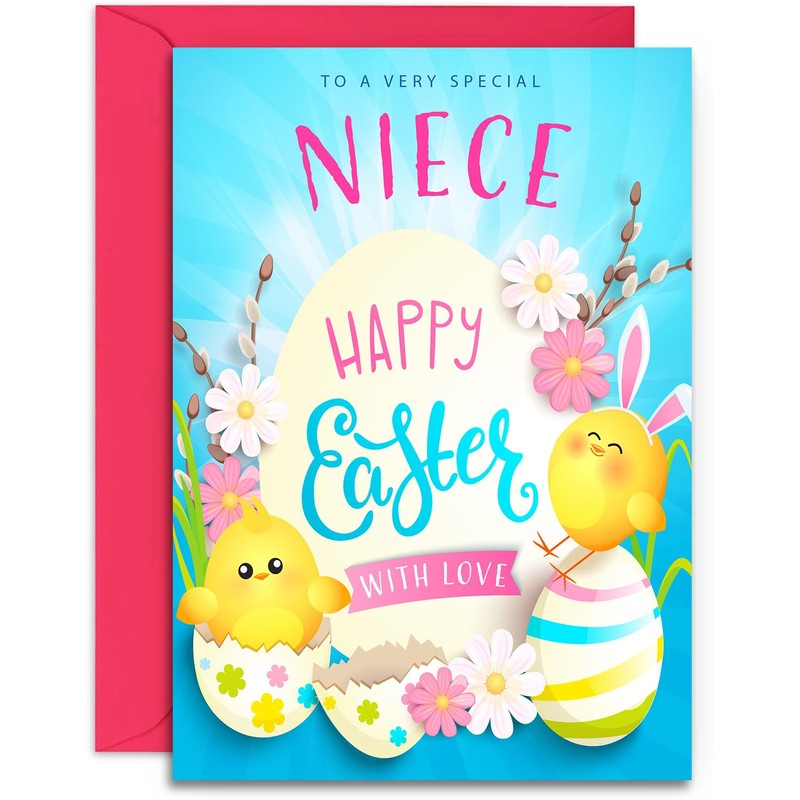 - COLOURFUL NIECE EASTER CARD ⭐ Vibrant Easter greeting card with adorable chick illustrations, decorative Easter eggs, and spring flowers⭐ Click the second image for the text inside the card.
