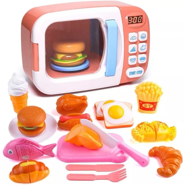 Juguete De Cocina para niños incluye un microondas electrónico giratorio multifuncional con pantalla de visualización y luces, comida para jugar como un juego de perros calientes, hamburguesas, tostadas, para ensamblar, platos y condimentos