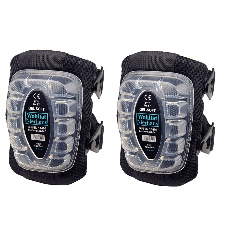 • Original Nierhaus Gelmaster No. 67 knee pads pair, robust and box-shaped of the premium class, with gel insert, particularly ergonomic, puncture resistant, performance level 1 = puncture resistant of more than 100 Newton, weight pair 0.740 kg.