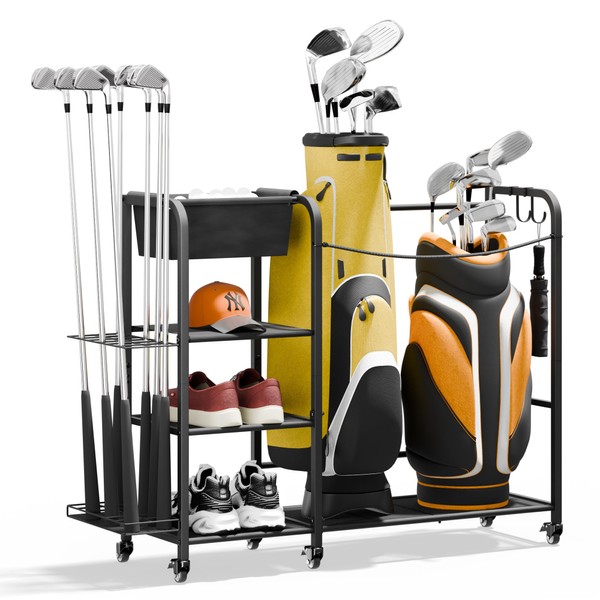 - Multi-Purpose Golf Bag Storage:Stores 2 golf bags with an anti-slip strap, 3-tier shelves for shoes, gloves, and hats, a side rack for ~20 clubs and 2 removable hooks. The canvas upper basket offers scratch-free storage for balls and accessories — keep your golf gear organized, accessible, and off the floor.