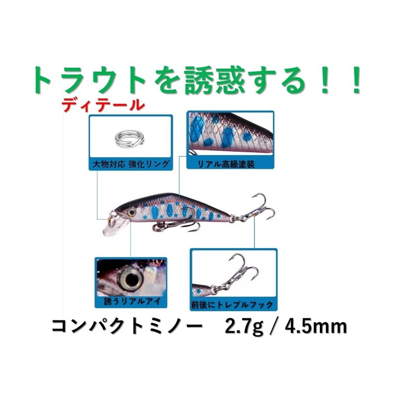 - Lightweight sinking type compact minnow!! Lightweight minnow that conquer shallow stream with a light 2.7g The lightweight yet streamlined body line allows you to catch a lot of fish when you hit it. As a result, you can expect a big fish