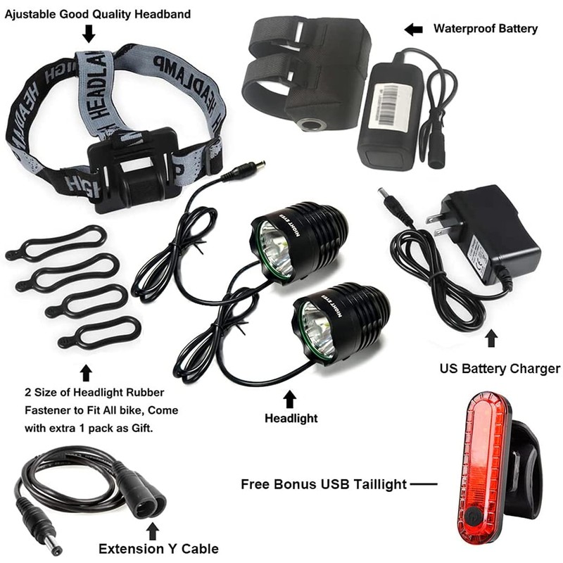 Night Eyes- Mountable 1200 Lumens Mountain Bike Headlight Bike LED Light -Rechargeable 8.4V 8800mA ABS Waterproof Battey-Free Aluminum BikeTaillight Bonus -NO Tool Required (2PACK Black)