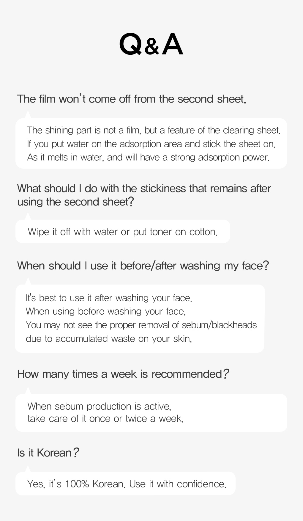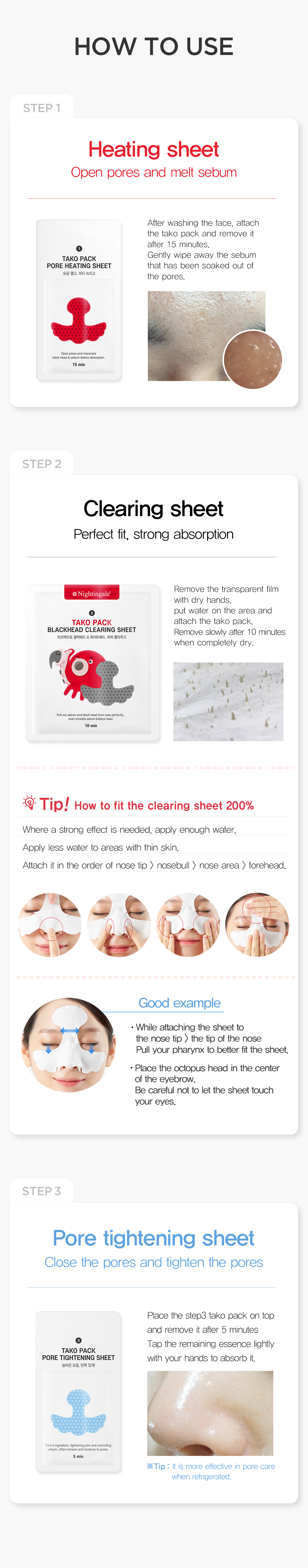 - How to Use: STEP1. After facial washing, put Step 1 mask sheet on your face and remove in 15-20 minutes. Gently wipe away the sebum that comes out of the pores. STEP2. Remove the transparent film of the Step 2 pack sheet with dry hands. Wet the area to be used sufficiently with water, and then attach the sheet from the tip of the nose toward the forehead. STEP3. Attached Step 3 mask sheet and remove in 5-10 minutes. Pat the remaining essence for absorption.