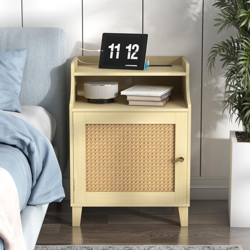 - Convenient Charging Station---Say goodbye to limited charging options with our rattan nightstand's 2 AC power outlets, 1 USB port and 1 type C, all UL certified. You can easily charge your electronic devices or plug in a lamp by your bed or sofa, making your life more convenient.