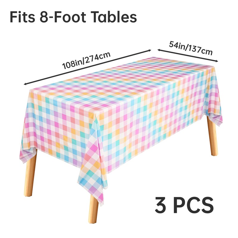 NiHome 3PCS Disposable Tablecloth 54"x108" for 8ft Tables, Spill-Proof Oil-Resistant Plastic Table Covers for Birthday, Picnic, Wedding, Holiday, School, Indoor Outdoor Events (Macaron Rainbow Plaid)