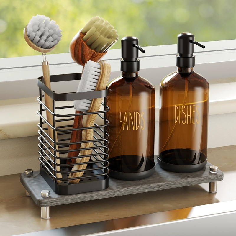 - Upgraded Dish Soap Dispenser Set: Our set includes two amber glass bottles with sturdy black stainless steel pumps, a high-quality stainless steel dish brush holder suitable for long-handled brushes, an efficient stone drying tray, and two stickers.