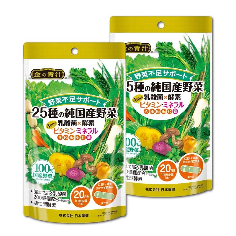 NIHON YAKKEN 金の青汁(R) 25種の純国産野菜 乳酸菌 × 酵素 +1日分の ビタミン ・ ミネラル サプリ (60粒 × 2袋 40日分 / 農薬不使用 無添加) 九州産大麦若葉 カプセル (野菜不足 栄養バランスが気になる方) マルチビタミン