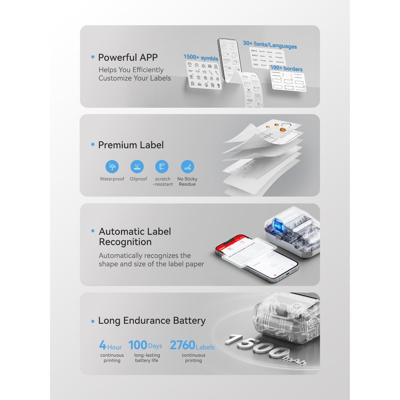 - 【Portable and Rechargeable】 The thermal label printer weighs 293g and can slide into your pocket, easy to be carried anywhere. Built-in durable and rechargeable 1500mAh battery standby time up to 100 days on a single charge.