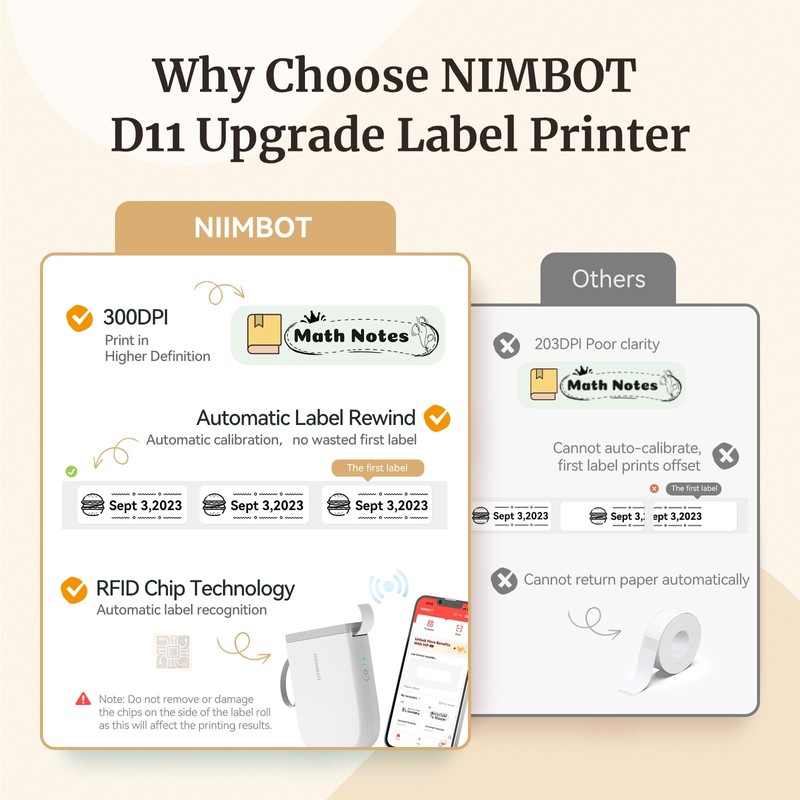- Rich in Features: NIIMBOT D11 new version portable label maker machine support automatic calibration, the first label paper will not be wasted. At the same time, this mini label printer can support 6 mobile phone printing, to meet the use of multiple people, printing speed increased to 50mm/s, improve printing efficiency. 【Note】This label maker is monochrome printout, which only prints black text.Can not print in color