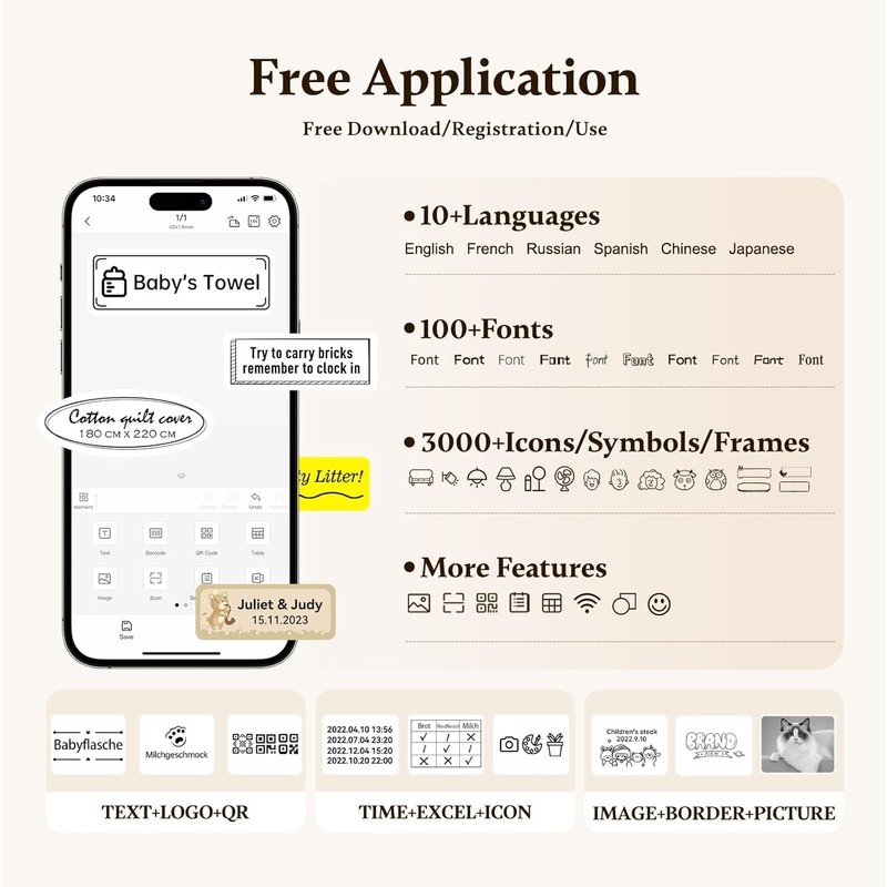 - 【Rich Label Styles & Customize Your Own Label】The “NIIMBOT” APP has built-in variety of label templates,19 fonts, 100+frames, 1500+ Icons, support to insert following elements: Text, Bar code, QR code, Symbol, Table, Image, Serial number, Time, Line, Figure, you can also adjust these elements’ style, such as font, style, align, spacing. Fly your imagination to customize your own label and templates