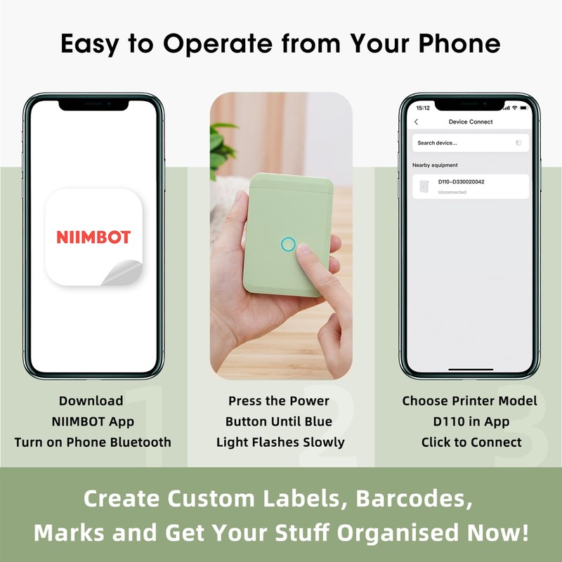 • Thermal Label Printer: The NIIMBOT Wireless Handheld Travel Printer D110 is half the size and weight of traditional label manufacturers. Weight: 140g (battery included) 1 roll of label tape inside the body. Compatible with smart devices such as Android, IOS and so on, no hassle to install drivers, easy to connect