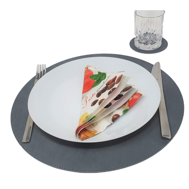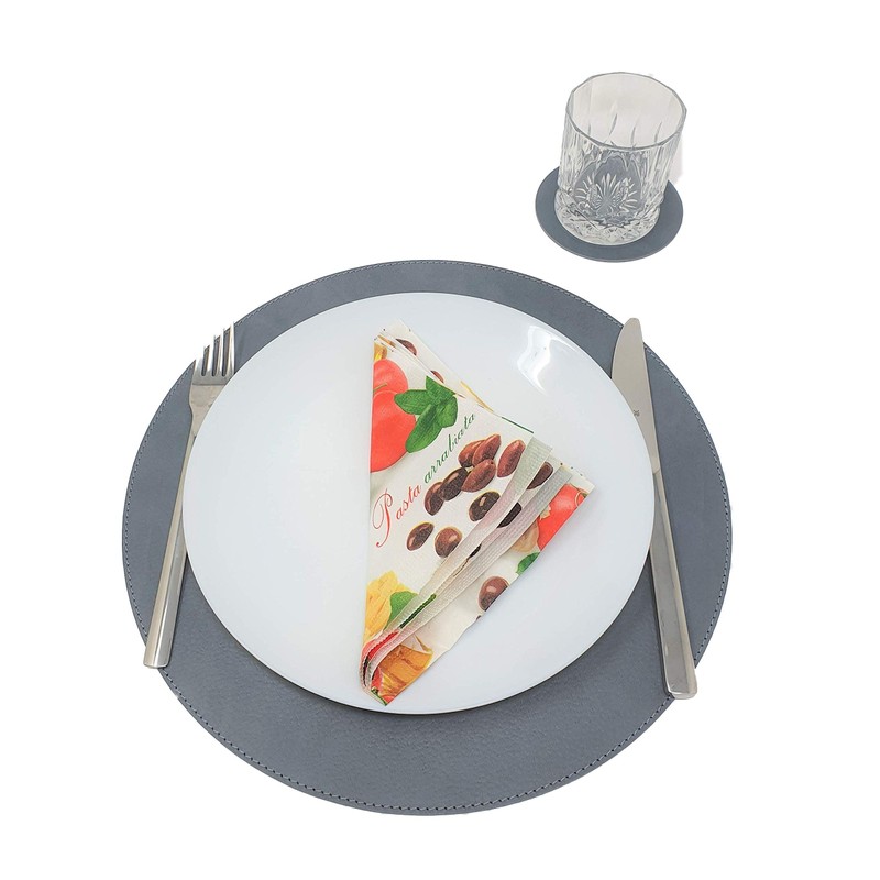 Nikalaz Recycled Leather Round Placemats and Coasters, Placemats, Set of 2 Table Mats, Placemats 33 cm (Dirty Grey)