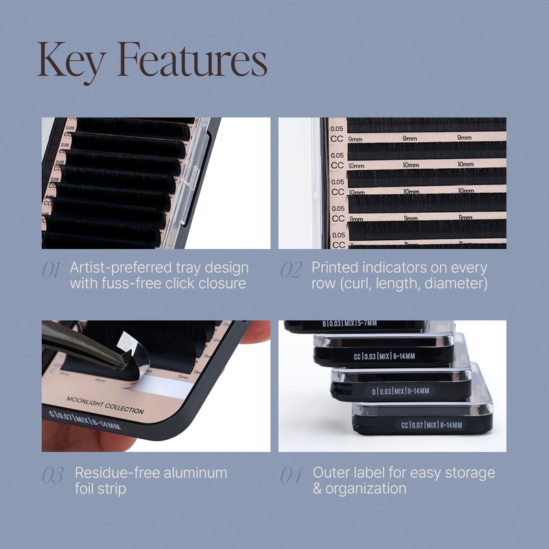 Each tray is expertly designed with the elegance of Mink-Style lashes, the darkness of Silk-Effect Lashes, and the taper of Cashmere-soft Lash Extensions. Softer than traditional mink lash extensions, darker than the typical silk and lighter than the standard cashmere fiber, this blend delivers what can only be described as the lash artist dream fiber.