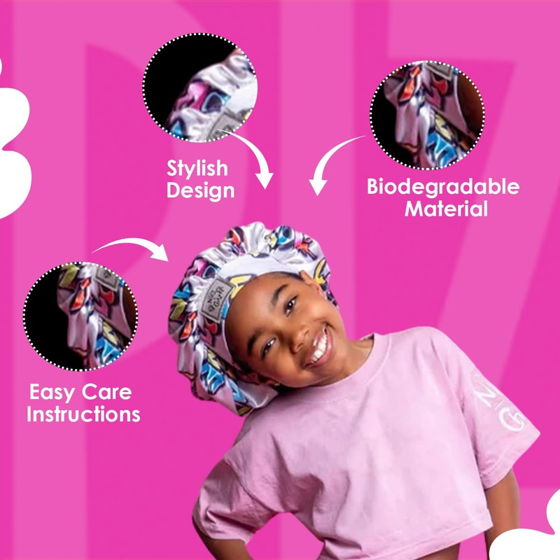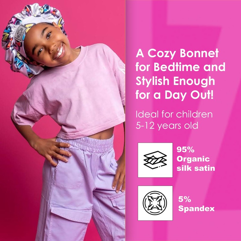 The SNUG-A-BUG Silk Bonnet is meticulously crafted to safeguard your kid’s curls from tangles and environmental stressors, helping hair stay healthy and vibrant during day and night escapades. Embrace eco-friendliness with our biodegradable bonnet, expertly woven from 100% organic silk satin, for a combination of luxurious softness and environmental responsibility. The SNUG-A-BUG Silk Bonnet is a hair accessory and a statement of care for your child's hair and the planet. Crafted from organic silk satin, it combines softness with environmental responsibility, helping your kid’s curls stay nurtured and protected with every use.