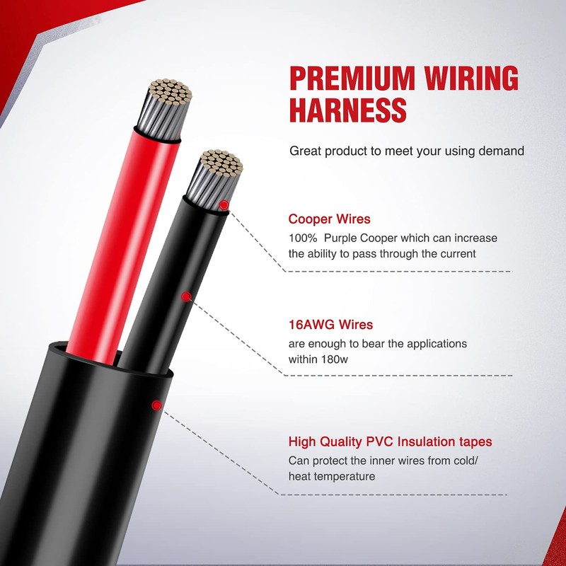 Product features: 1. Illuminated on/off switch 2. Power Relay 3. Blade fuse 4. More than 12ft of wire 5. 2 sets of power connectors to light fixtures note: maximum Wattage: 180W; max Ampere: 15A operating voltage: 12V DC power please finish the installation by professionals or install the wiring harness under the guidance of professionals.