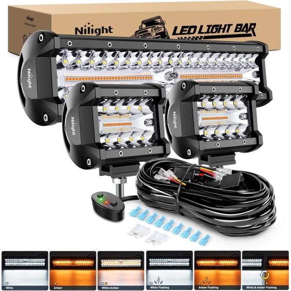 - 6 Modes with Memory Function: Regulate mode in turn by switch of the lights(white/amber/white & amber/white strobe/amber strobe/ white & amber strobe). The light bar will remember the mode you last used, you won't be annoyed by switch-mode frequently. It's great to use for warning lights, fog lights, driving lights, or work lights. Come with NILIGHT upgraded version wiring harness kit