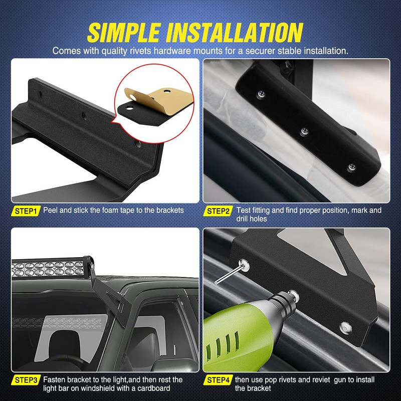 - Installation: Follow the 5th image, first peel and stick the foam tap to the bracket, then test fitting to mark mounting position and pre-drill the holes & fill with silicon, and then insert mandrel into the rivet gun and put rivet gun into the holes, finally squeeze the rivet gun until you get the snap
