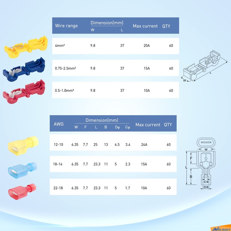 - Quality Products: The tinned copper contacts provide maximum conductivity and prevent the wires from shorting out, and it will not bend even when tapping into thicker wires. The Quick splice T-Tap connectors will lock on the wire securely and plastic housing will not open after the wire is snapped into it.