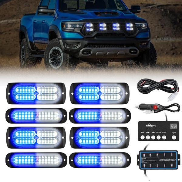 Nilight 8PCS Led Strobe Lights with Controller 12V 24V Sync Feature Blue White Strobe Light 12 24 LED Surface Mount Emergency Hazard Warning Lights with Strobe Controller for Vehicle Car Truck RV ATV