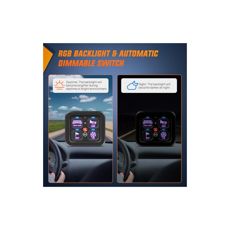 - RGB Panel Backlits & Automatic Dimmable: The panel can be set as different colors to meet your own need, you can select your favorite color according to different scene. Also, Not as dazzling as other switch panels. The Backlit of Nilight switch panel is adjust automatically according to the surrounding environment. Maintain the most comfortable visual brightness while driving