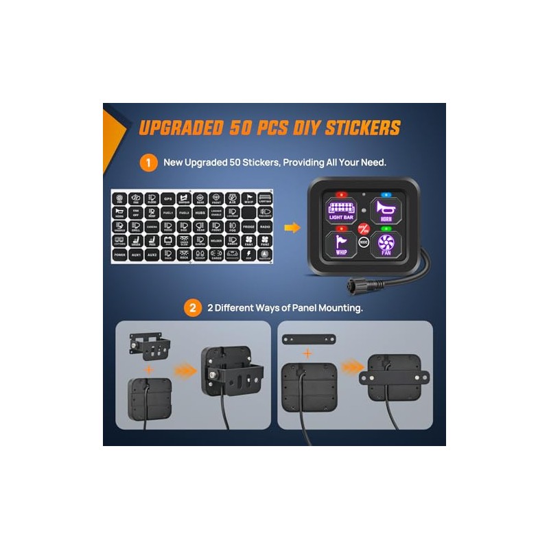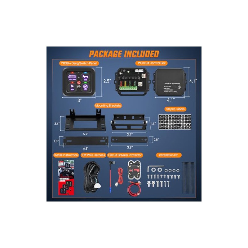- All in one Design: The 4 gang switch panel system includes all installation hardwares even the add-a-circuit fuse tap. The packages includes a switch panel, circuit control box, blade fuses, extension wiring harness, power cable, circuit breaker, 50 pcs reusable labels and mounting hardware for switch panel and control box. Which is designed to work together with better performance. Don't needs to buy other parts