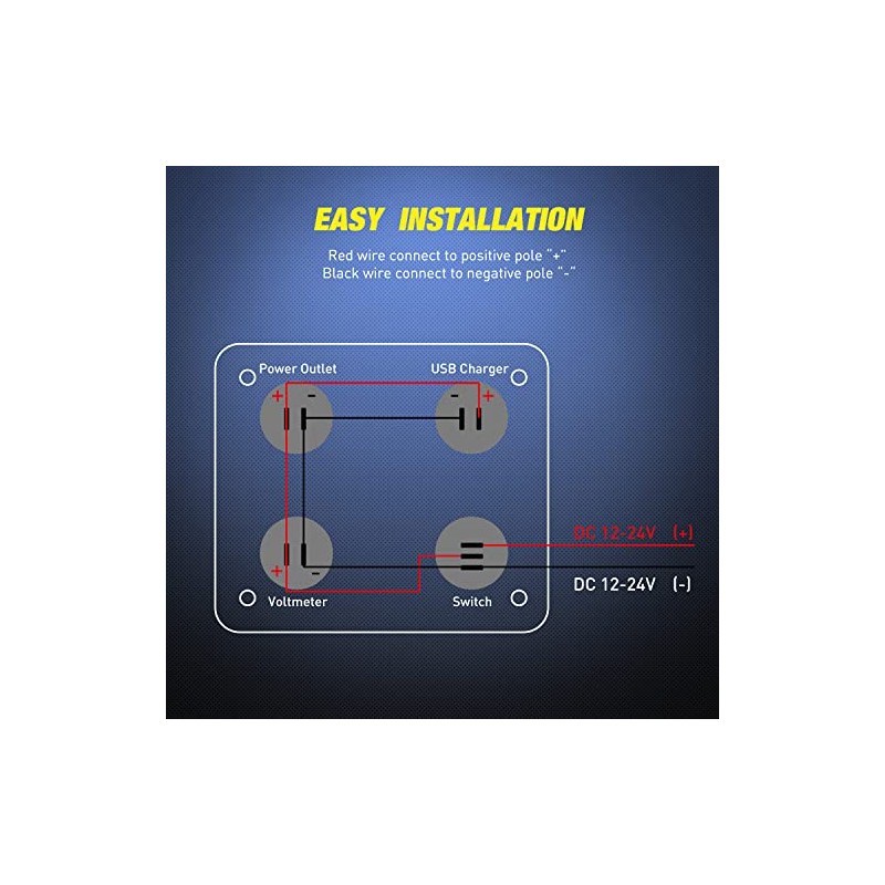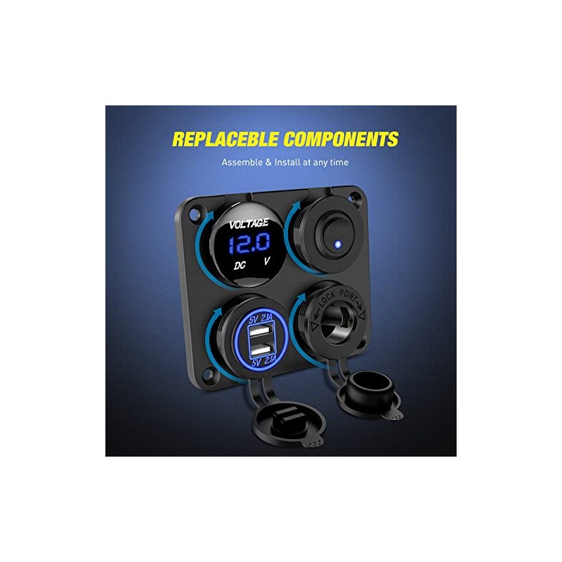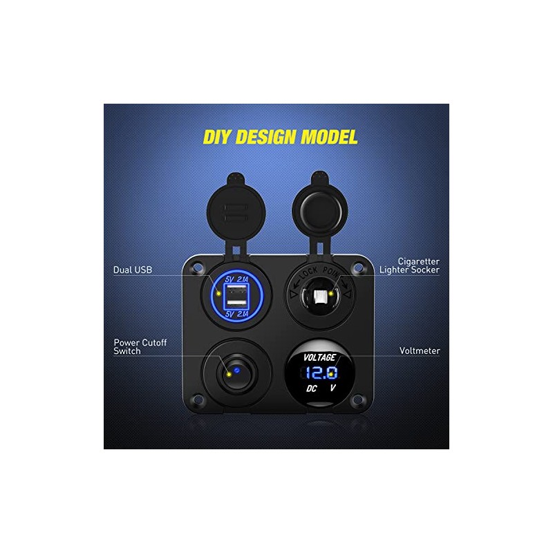 - 4 in 1 DIY Toggle Switch Panel: Dual USB Socket + Voltmeter + 12V Outlet + ON/OFF Toggle Switch. It's convenient for installing and operating. Also detachable to replace other charger sockets or anything else that fits