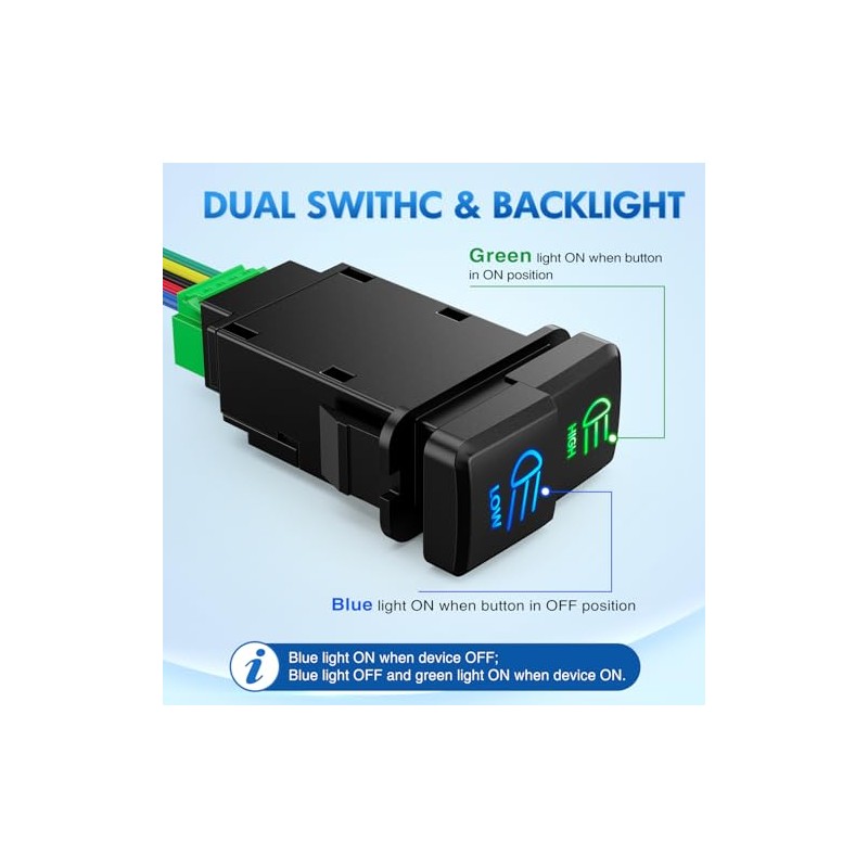 - Dual Push Button Switch: Dual on/off button 2-in-1 design, suitable for High Beam & Low Beam at the same time.The ON-OFF rocker switch with SPST design (single pole single Throw) is manufactured to fit in the OEM switch blank for your cars. It come with a small pigtail that plugs into the back of the switch for better installation