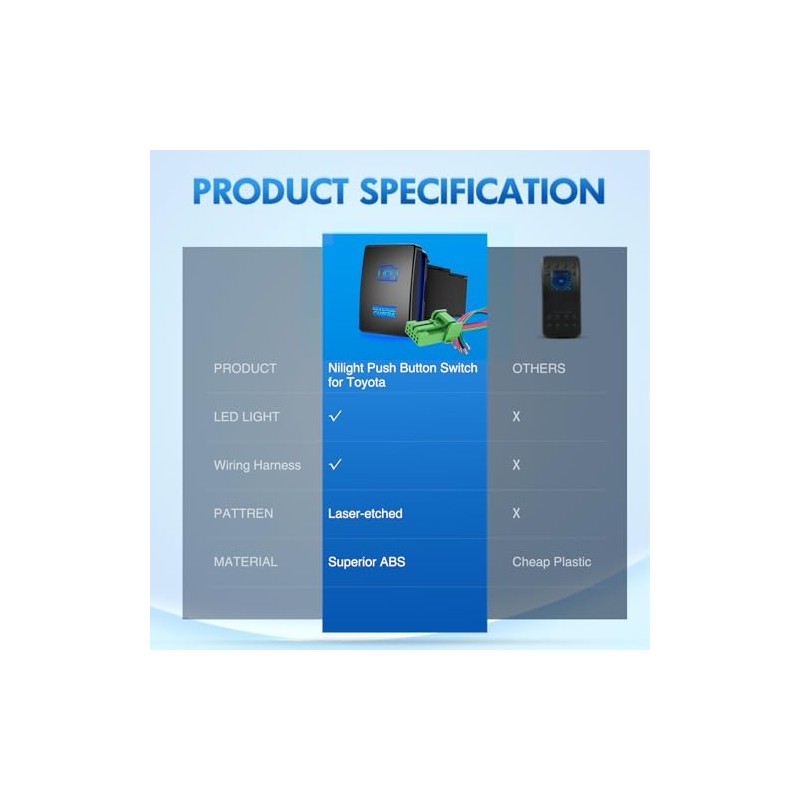 - Push Button Switch: The ON-OFF rocker switch with SPST design (single pole single Throw) is manufactured to fit in the OEM switch blank for your cars. It come with a small pigtail that plugs into the back of the switch for better installation