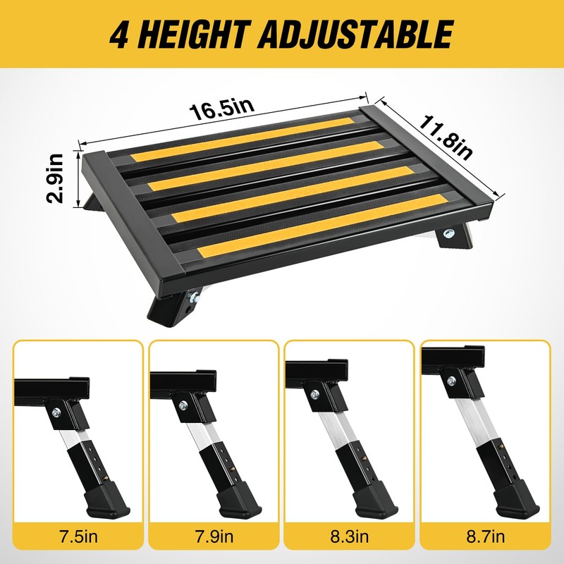 - STURDY AND STABLE: Adjustable RV step stool is made of high-strength aluminum alloy material to ensure it is strong, durable and has a long service life. The step stool can confidently hold up to 500 pounds, more than enough for anyone, and its waterproof coating helps prevent rust.