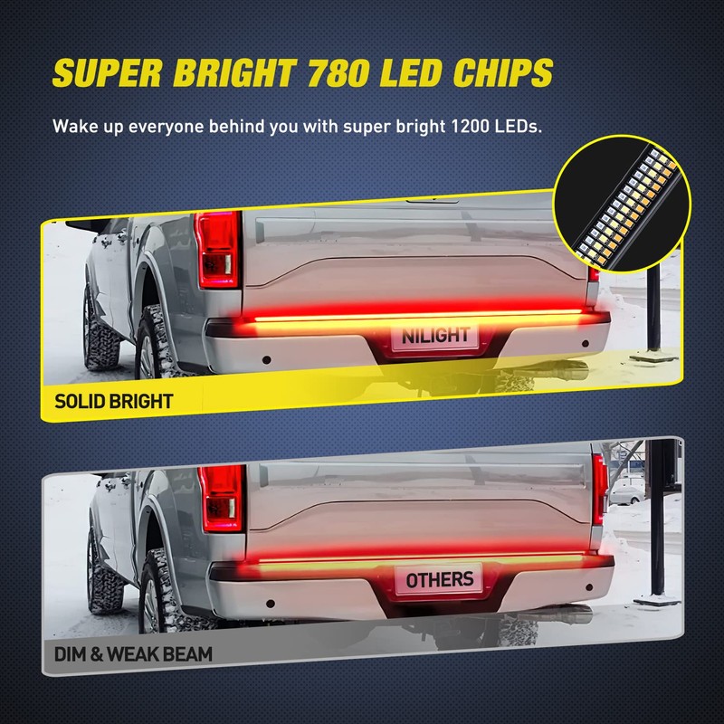 Nilight Truck Tailgate Light Strip 48" Aluminum Frame Triple Row 780 LED Strip with Red Running Brake Lights White Reverse Amber Sequential Turn Signals Strobe Lights,2 Years Warranty