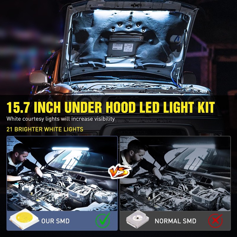 - Super Brightness: The 15.7 inch/40cm underhood light strip includes 21 pcs SMD 5050 ultra bright LED chips and outputs a 6000k white light. The light strip can light up your entire car engine bay at night. It's an excellent addition if you perform vehicle inspection, maintenance, and repair at night