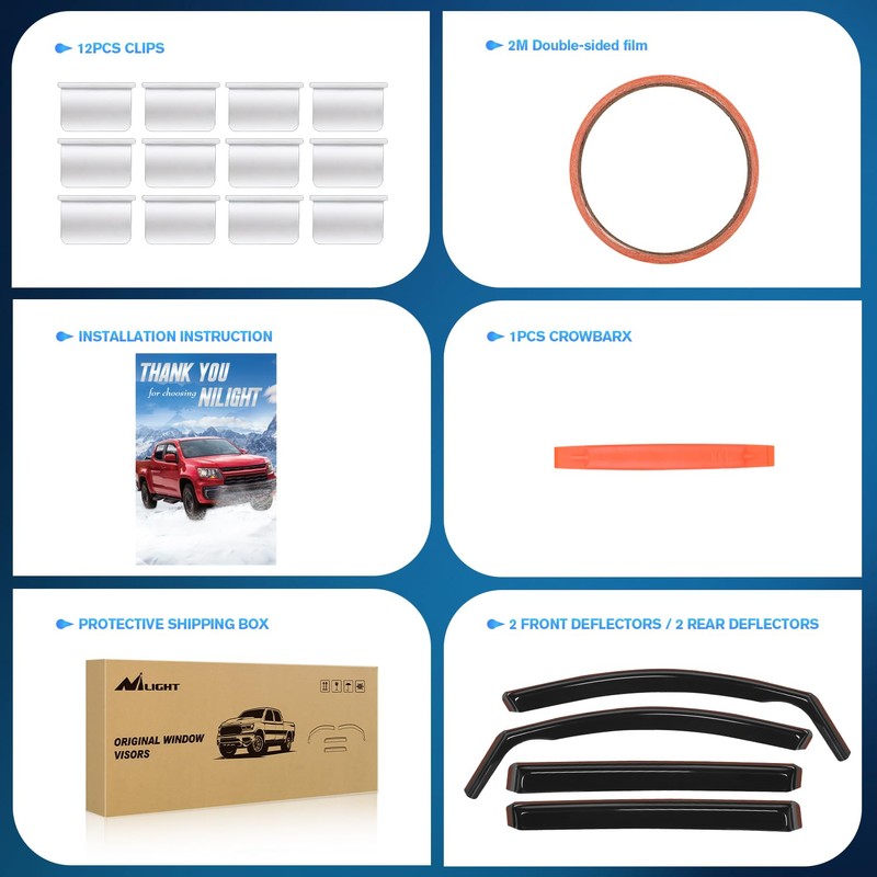 - PACKAGE INCLUDED:4 PCS Rain Guards,12pcs clips,Crowbar 1pcs,78inch double-sided tape and installation instruction