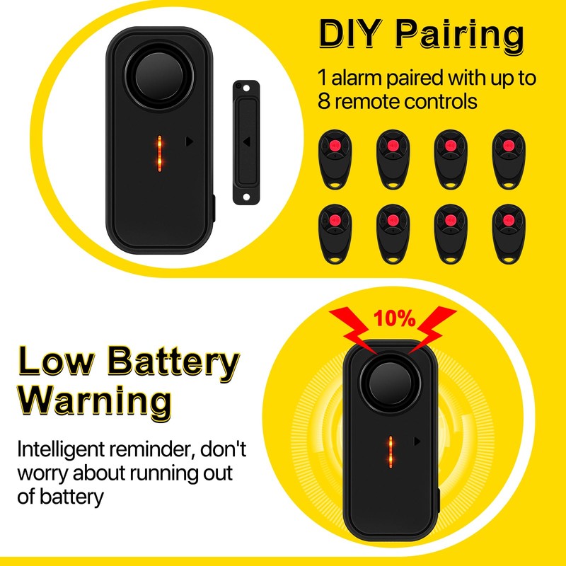 - 【200FT Remote Control】The wireless remote door alarm has remote control for easy operation, with a maximum range of up to 200feet, allowing you to manage and control the security system effortlessly from anywhere. Operate from a long distance without startling yourself—only the intruders! Activate the alarm before use by pressing the multi-function button for about 3s.