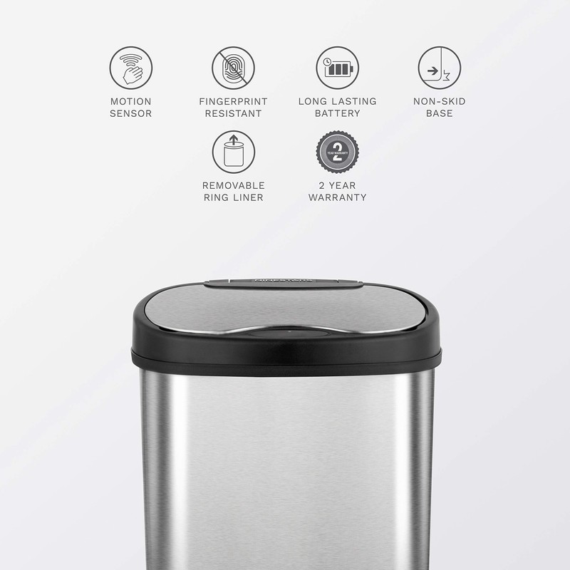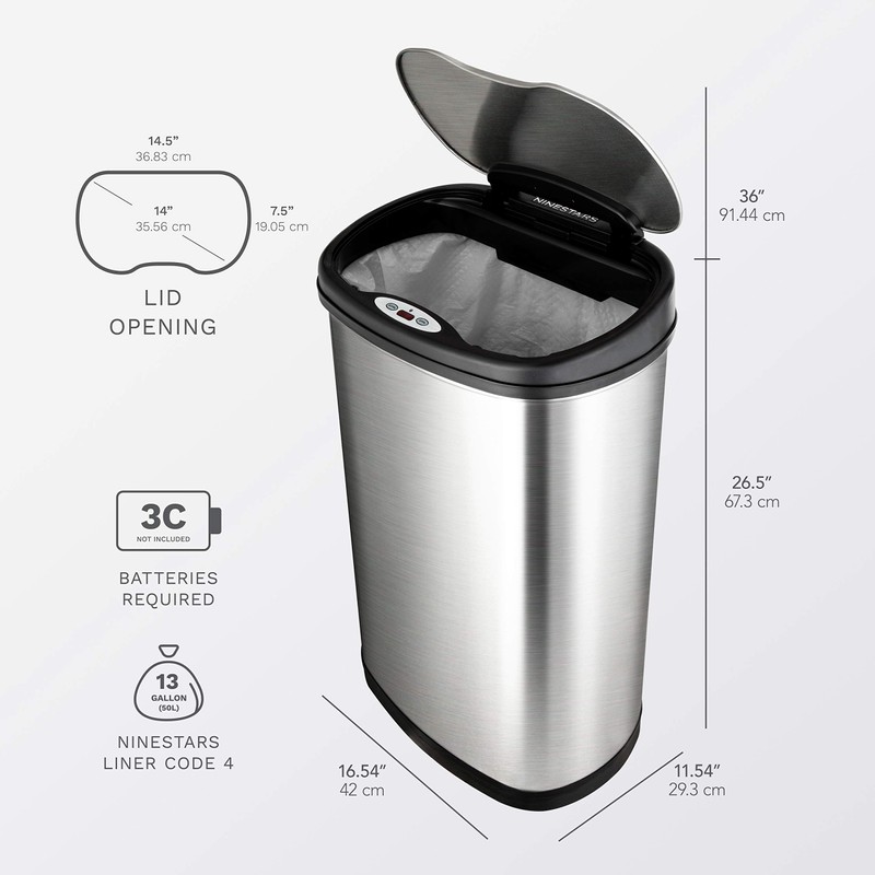 This combo of stainless steel touchless trashcans are designed and engineered by NINESTARS, the world's first legal patent holder. With one kitchen-sized and one bathroom-sized, you can use them in any room you choose, such as the kitchen, office bathroom, dorm room or a kid's room. These two trash cans use the most advanced sensor technology which can be found in all Ninestars trash cans. Pass your hand or debris within ten inches or a 130° angle from the infrared sensor and the lid will automatically open. The lid will remain open if debris or your hand remains within the range of the infrared sensor. After your hand moves away from the lid, it will close automatically. Each can includes a ring liner to keep trash bag from public view for a neat and clean appearance.