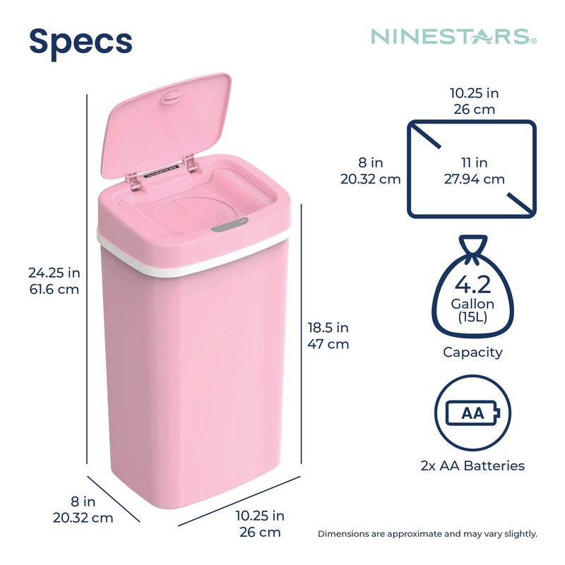NINESTARS NPT-16-1PK Automatic Touchless Motion Sensor Diaper Disposal Trash Can with lid, 4.2 gallon/16 L, Pink, Plastic