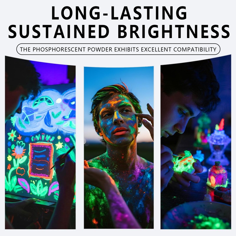 - Bright & Long-Lasting Glow - Formulated to charge quickly under light sources, this phosphorescent powder emits a bright glow that lasts for hours. Effective for creating attention-grabbing effects in low-light conditions.