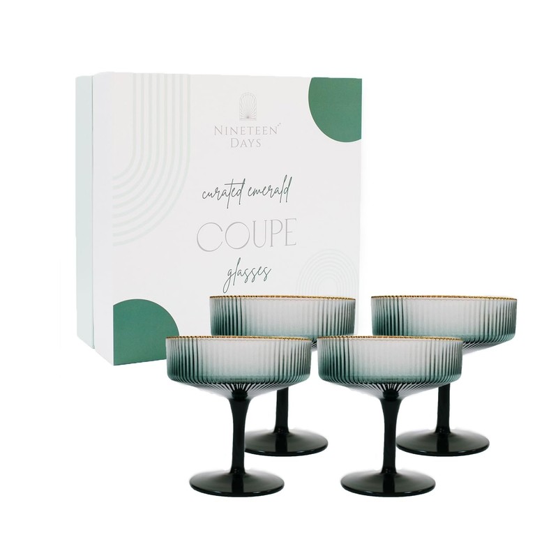 Nineteen Days Emerald Green Coupe Glasses w/Gold Rims 8oz | Coupe Glasses Set of 4 w/Gifting Box | Vintage Champagne Glasses | Green Coupe Glasses | Vintage Coupe Glasses | Espresso Martini Glasses