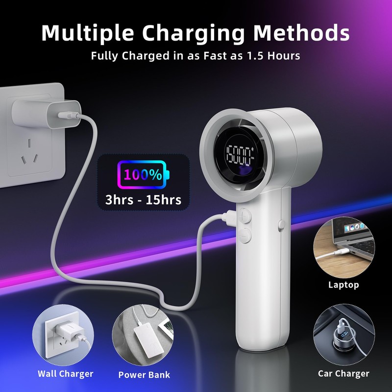 - 【Convenient Charging Options】: The portable fan can be charged using a USB interface, laptop, mobile power bank, or charger, making it ideal for on-the-go charging.