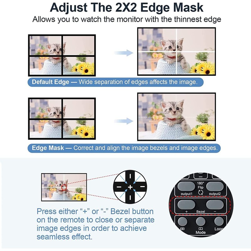- ★【2x2 video wall controller 】: HDMI TV wall processor can distribute one HDMI or DVI input signal device (DVD, TV Box, Xbox, Roku, Computer etc.) to 4 HDMI outputs display screens simultaneously, which via LCD splicing screens can form a complete dynamic large video wall screen and digital signage displays, Supports 180° image rotation and edge masking bring you an amazing visual experience.