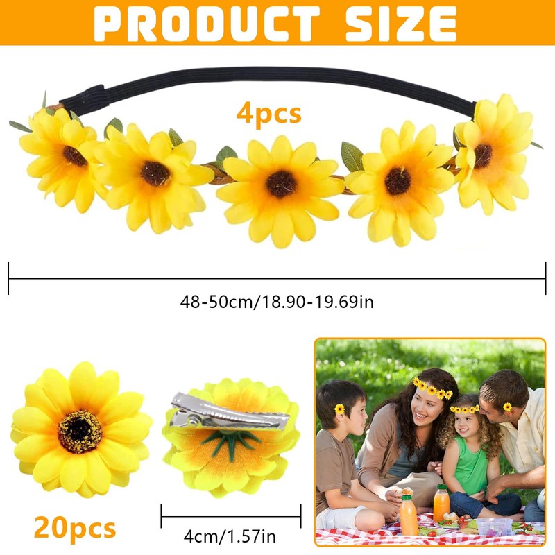 - Packing list: you will receive 4 sunflower headbands and 20 sunflower hair accessories that meet your daily wearing needs and give you different styles. The flower diameter 4cm, circumference of the headband is about 48-50cm, it is elastic and suitable for most people's head circumference.