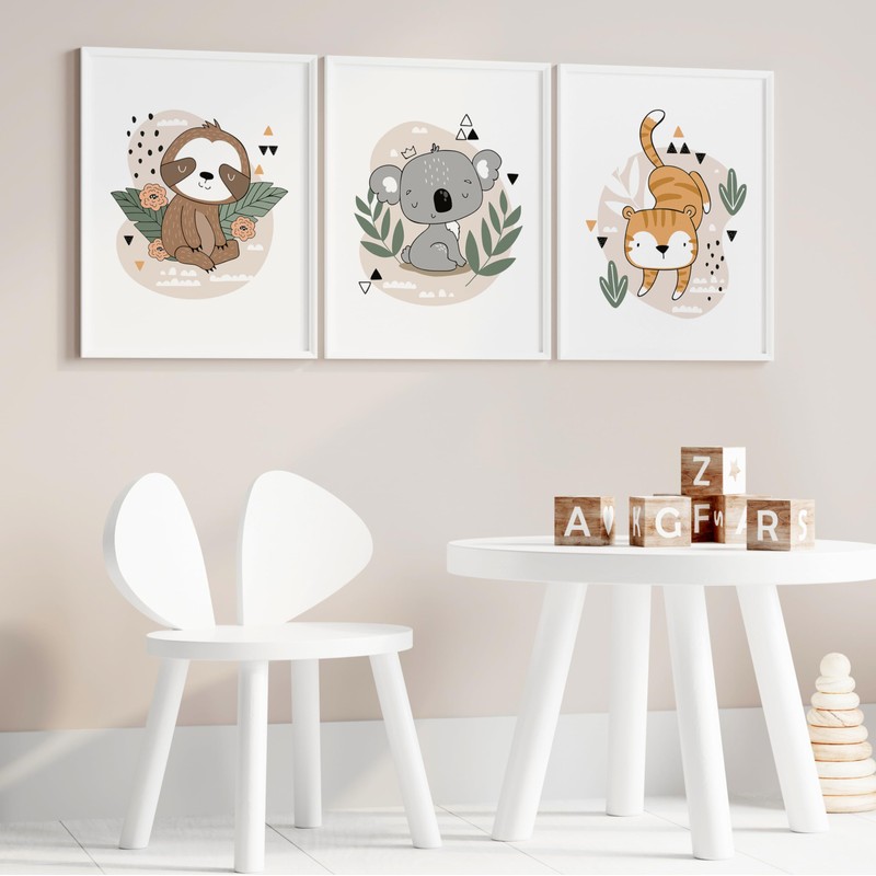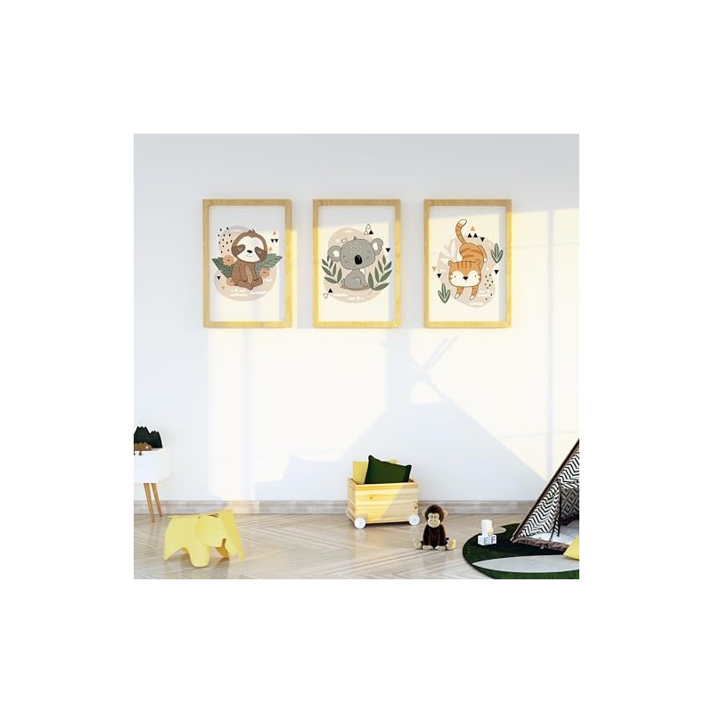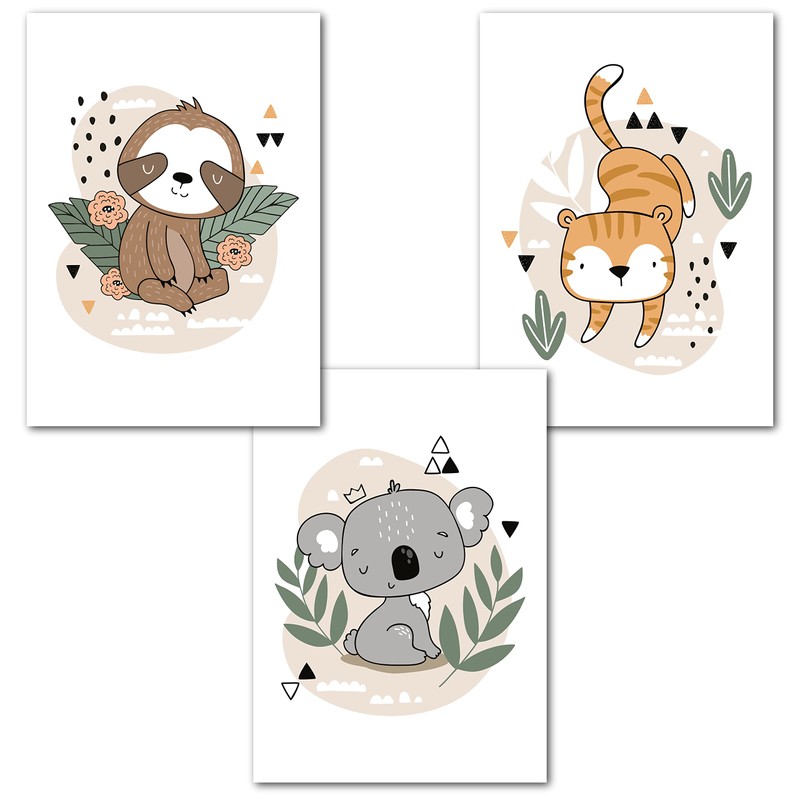 Ninky® Children's Room Pictures, Set of 3 Pictures, DIN A4, Wall Pictures, Baby Room Decoration, Safari Animals, Jungle Poster, Wall Poster, Decoration Baby Room (Set 2 - Sloth Koala Tiger)