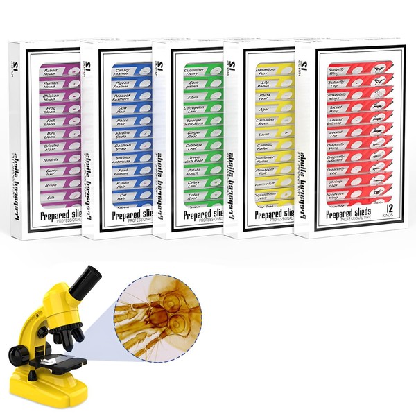 - 【60pcs kids microscope slides】- Contains prepared specimens of 12 Animals, Insects, Plants, Flowers, Blood and more 5 species. Total 60PCS. Distinguish with colors and cartoon patterns. Stimulate children's interest in exploring nature.