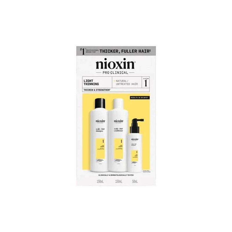 Nioxin Pro Clinical's System Kit 1 is an easy 3-step regimen designed for natural, untreated hair with light thinning. Clinically and dermatologically tested, this complete scalp & hair thickening system thickens and strengthens your hair against breakage from the root to tip. 8 out 10 users saw thicker, fuller hair in 30 days!