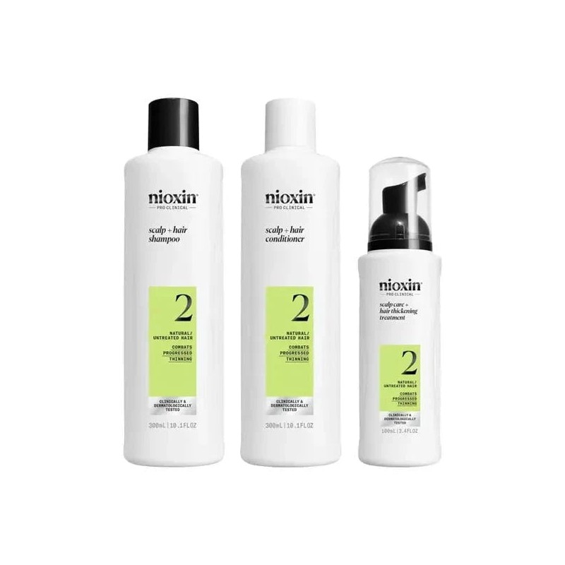 Nioxin Pro Clinical's System Kit 2 is designed for natural, untreated hair with progressed thinning. Clinically and dermatologically tested, this complete scalp & hair thickening system thickens and boosts your hair's density. 8 out 10 users saw thicker, fuller hair in 30 days!