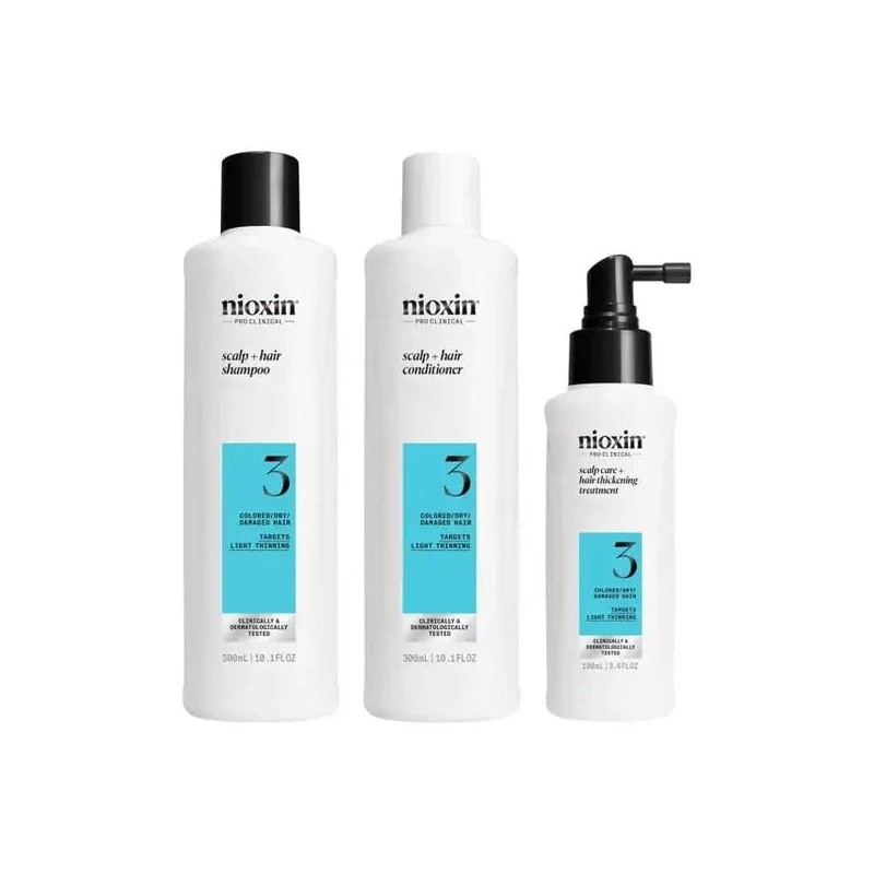 Nioxin Pro Clinical's System Kit 3 is designed for dry, damaged, colored hair with light thinning. Clinically and dermatologically tested, this complete scalp & hair thickening system thickens and strengthens your hair against breakage while providing color protection. 8 out 10 users saw thicker, fuller hair in 30 days!